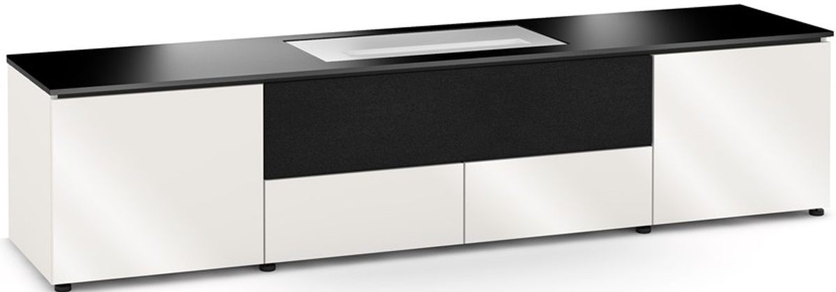 High-gloss, warm white side panels and doors beautifully offset the solid surface, black top. A simple installation with no need to open the wall or ceiling to run cables. All supporting components including a speaker system can be enclosed in the credenza to provide a beautiful and simple solution.Read More